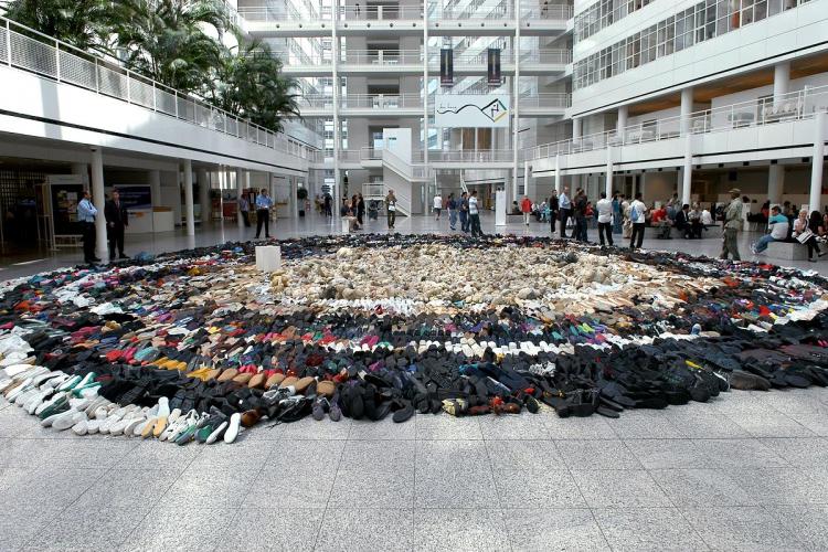 WOENSDAG - In het stadhuis van Den Haag is een tentoonstelling te zien met 5000 schoenen. De bij elkaar gezette schoenen zorgen voor een verrassend effect.