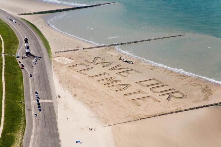 WOENSDAG - Het grootste strandlogo ter wereld, 154 meter lang, ligt op het strand van Breskens. Het logo waarop ”Save our climate” _Red ons klimaat_ staat, is gemaakt door leerlingen van het Willem van Oranje College uit Wijk en Aalburg. Het verdiende sponsorgeld gaat naar een onderwijsproject voor jongeren in India.