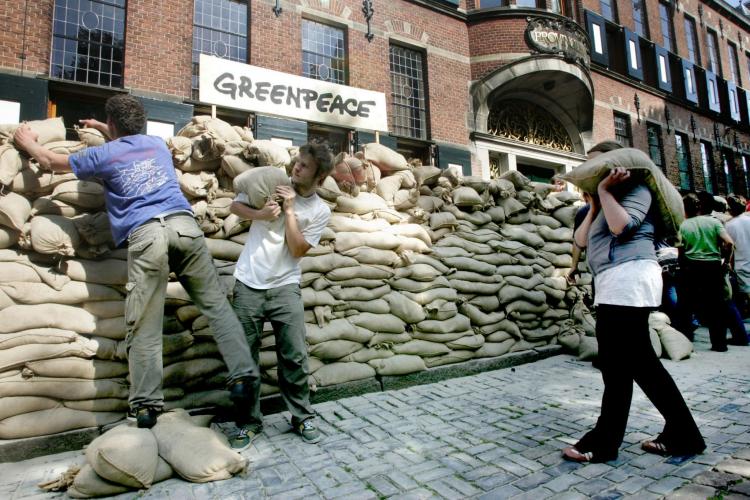 WOENSDAG - Milieuorganisatie Greenpeace protesteert in de Groningse Eemshaven tegen de bouw van twee nieuwe kolencentrales. Op de plek waar de nieuwe centrales moeten komen, haalden de actievoerders gestort zand weg. Het afgegraven zand ging in ongeveer 2000 zakken naar het provinciehuis in Groningen, waarmee er een nooddijk van zo’n 25 meter lang en 2 meter hoog mee werd aangelegd.