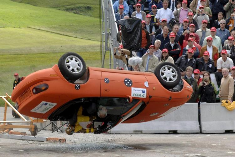DONDERDAG - Op een circuit in het Zwitserse Wildhaus maken cabrio’s een koprol. De test met de open auto’s werd georganiseerd door een autoverzekeraar die de veiligheid van cabrio’s wilde demonstreren.