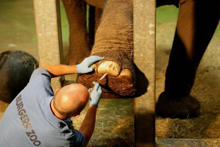 MAANDAG - Olifanten in Burgers Zoo in Arnhem krijgen een grondige beurt van een pedicure: de nagels worden verzorgd en gevijld. Deze maandelijkse behandeling is nodig om te voorkomen dat de dieren infecties aan de poten krijgen. Als beloning voor het aanbieden van zijn poot, krijgt de olifant een appel.