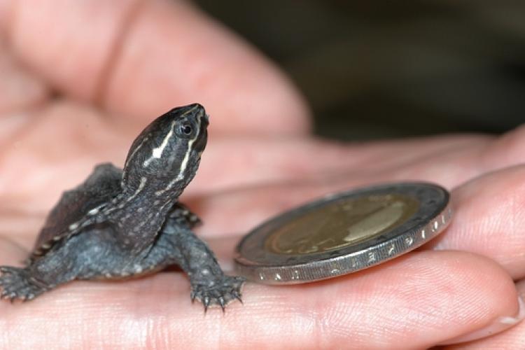 WOENSDAG - Bij reptielenzoo Serpo in Delft is na een broedduur van ruim zestig dagen een muskusschildpadje uit het ei gekropen. Dit schildpadje is 2,3 centimeter lang en weegt nog geen 4 gram, bijna net zoveel als een 10 eurocent muntstuk.