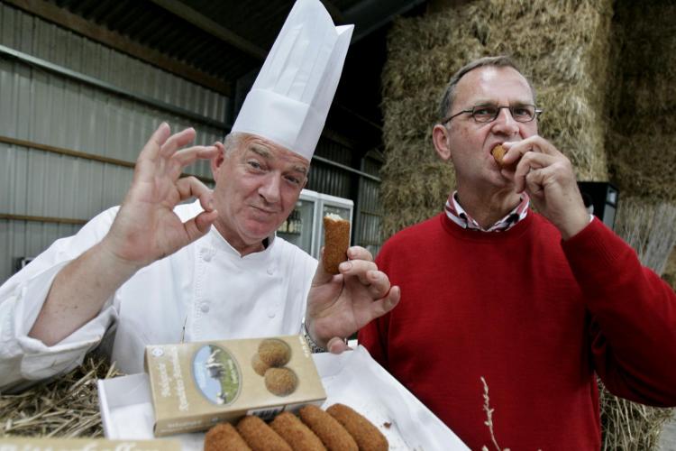 WOENSDAG - Ko van Twillert (r.), biologisch boer te Doornspijk en voormalig topkok Cas Spijkers proeven op het bedrijf Ko Kalf in Doornspijk de nieuwe kroket van 100 procent biologisch rundvlees. De kroket is bereid met alleen biologische ingrediënten.