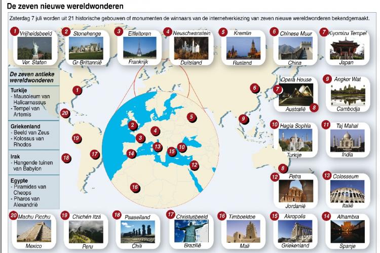 Afgelopen zaterdag, op 07-07-07, werden de nieuwe wereldwonderen gepresenteerd tijdens een spektakel in de Portugese hoofdstad Lissabon. Dit was de uitslag: De Chinese Muur, woestijnstad Petra, het Christus-beeld in Rio de Janeiro, Machu Picchu, Chichen Itza, het Colosseum in Rome en de Taj Mahal in de Indiase stad Agra. De winnende landen vieren feest (foto).