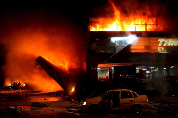 DINSDAG – Bij een vliegtuigongeluk in de Braziliaanse stad Sao Paulo komen meer dan 200 mensen om het leven. Het toestel gleed door de regen van de landingsbaan, boorde zich in enkele gebouwen en vloog in brand. - Foto's ANP / EPA / RD