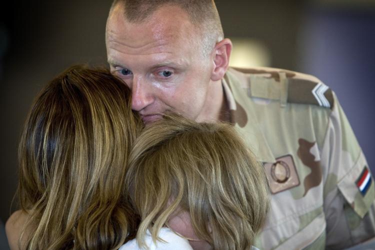 DINSDAG – Militair Nico Geerts neemt op vliegbasis Eindhoven afscheid van zijn kinderen. De militair vertrekt naar Uruzgan in Afghanistan om te helpen bij de wederopbouw van het land. - Foto's ANP / EPA / RD