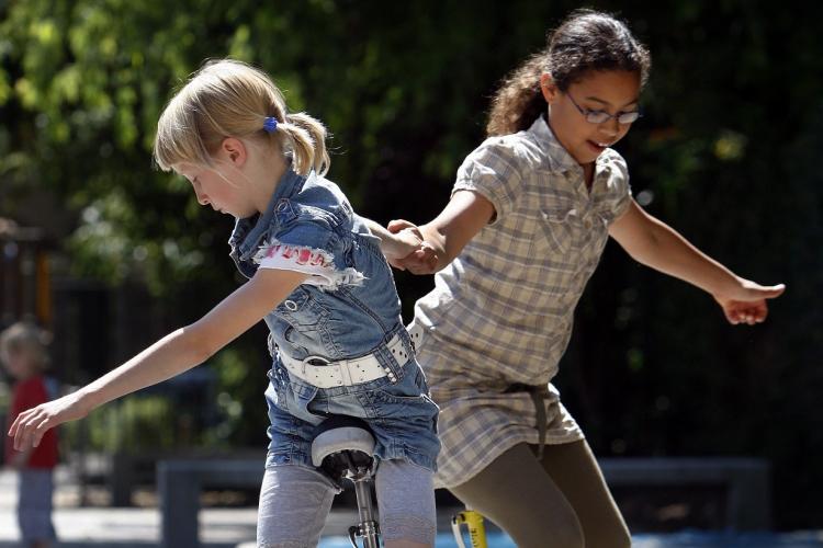 DONDERDAG – Meisjes houden elkaar in evenwicht op de eenwieler. Eenwieleren is een rage geworden onder jongeren. Het is minder zwaar dan fietsen, maar vraagt wel om een precies evenwicht en goede concentratie. - Foto's ANP / EPA / RD