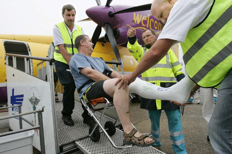 VRIJDAG – Op Rotterdam Airport landt de eerste vlucht met zes gewonde vakantiegangers. In de zomer komen er minder brekebenen aan op het vliegveld dan in het wintersportseizoen. - Foto's ANP / EPA / RD