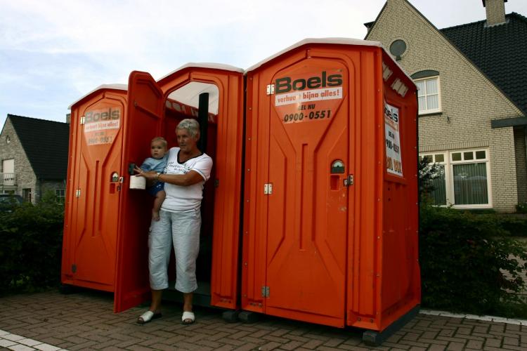 MAANDAG – Inwoners van de wijk Rudebroeck in het Noord Brabantse Zijtaart moeten gebruik maken van een chemisch toilet. Door de hevige regenval in het weekend is de riolering overbelast, waardoor ze geen gebruik kunnen maken van de wc. - Foto’s ANP/EPA en RD