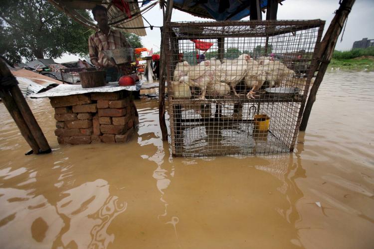 DONDERDAG – Een man uit India probeert zijn kippen droog te houden met een zelfgemaakt kippenhok. Hevige moessonregens en overstromingen in het noorden van India en Bangladesh hebben aan zeker 178 mensen het leven gekost. Negentien miljoen mensen zijn op de vlucht geslagen of zitten vast in ondergelopen gebieden.