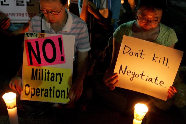 MAANDAG - Zuid-Koreanen demonstreren in Seoul. Ze willen dat de terroristische organisatie Taliban in Afghanistan hun 21 gegijzelde landgenoten vrijlaten.