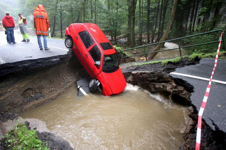 VRIJDAG - Ook Duitsland heeft veel last van de regen. In Arnsberg stortte een brug in. Een automobiliste had niets in de gaten en maakte een fikse val.