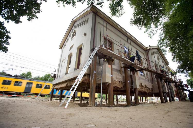 VRIJDAG - Een bijzonder gezicht in Houten: het station hing vrijdag 3 meter boven de grond. Het gebouw wordt 300 meter verderop weer neergezet.