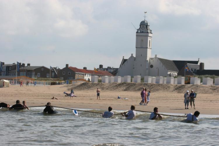 ZATERDAG - In Katwijk vind het jaarlijkse touwtrekfestijn in de branding plaats. Onder grote inspanning vochten diverse teams in zee uit wie de sterkste was. - Foto Arie van Dijk
