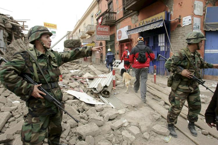 MAANDAG - Soldaten van het Peruaanse leger patrouilleren in Pisco, een van de steden die door een zware aardbeving werd getroffen. De militairen moeten de orde herstellen in onder andere Pisco, Ica en Chincha, waar plunderaars eerder konvooien met hulpgoederen aanvielen. - Foto's ANP, EPA, RD
