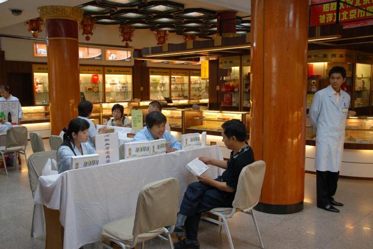 DINSDAG - Bij de entree van de Tongrentang apotheek in Peking geven medewerkers advies aan patiënten. Veel Chinezen geven de voorkeur aan de Chinese traditionele medicijnen boven de westerse medicijnen die ziekenhuizen voorschrijven. Niet alleen omdat ze geloven dat de Chinese medicijnen minder bijwerkingen hebben, maar ook omdat de gezondheidszorg voor steeds meer Chinezen onbetaalbaar geworden is.