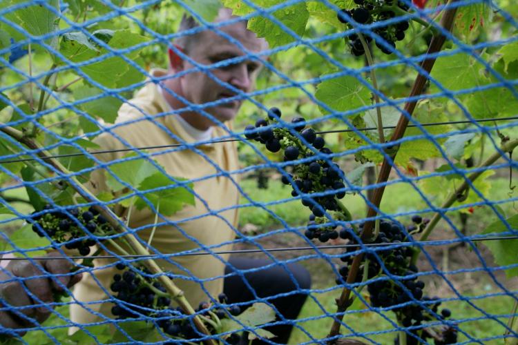 WOENSDAG - Om te voorkomen dat merels en spreeuwen zijn druiven opeten, plaatste Inno Venhorst dinsdag een net over een deel van zijn wijngaard in Dodewaard. Villa Hehum langs de Waal is de enige Nederlandse wijngaard die in de uiterwaarden ligt. De wijngaarden hebben dit jaar veel last van coulore (misoogst) bij de blauwe druiven. Door het warme voorjaar is veel bloesem verdroogd en zitten er relatief veel kleine groene druifjes tussen. Om de zon wat meer kans te geven worden de blauwe druiven dit jaar later geoogst.