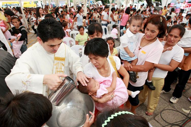WOENSDAG - Een rooms-katholieke priester doopt een meisje tijdens een massale doopplechtigheid in de San-Agustinkerk in de Filipijnse hoofdstad Manilla. Meer dan 5000 kinderen werden tijdens deze bijeenkomst gedoopt.