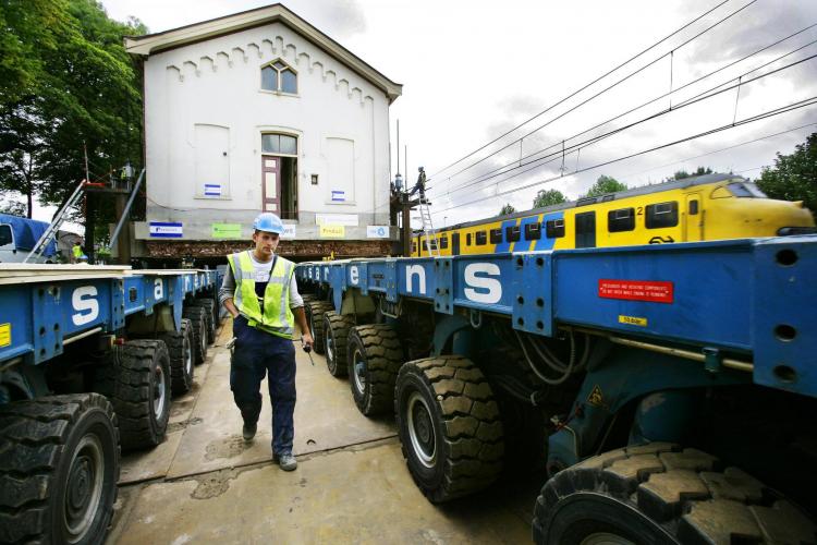 DONDERDAG - Duizendwielenwagens staan klaar om het station van Houten te verplaatsten. De verplaatsing van het station aan het Stationserf in Houten is nodig wegens de verdubbeling van het spoor tussen Utrecht en Den Bosch. Het gebouw doet al sinds 1935 geen dienst meer als station. Het werd de afgelopen jaren gebruikt als basisschool en als woonhuis. Na de verplaatsing gaat de stichting Station op Wielen, die zich inzet voor het behoud van dit cultureel erfgoed, het gebouw in oude luister herstellen.