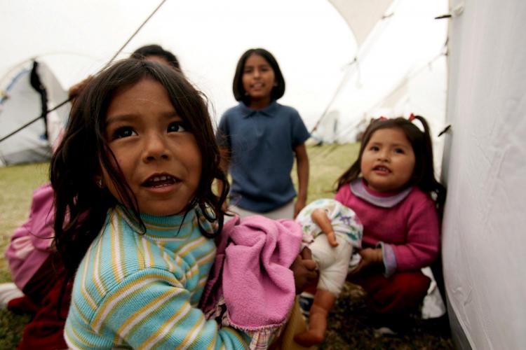 VRIJDAG - Deze Peruaanse meisjes kunnen weer lachen nadat ze de aardbeving van vorige week in hun woonplaats Pisco overleefden en onderdak vonden in een opvangkamp. De kinderen zijn tijdelijk gehuisvest in San Andres, een buitenwijk van Pisco.