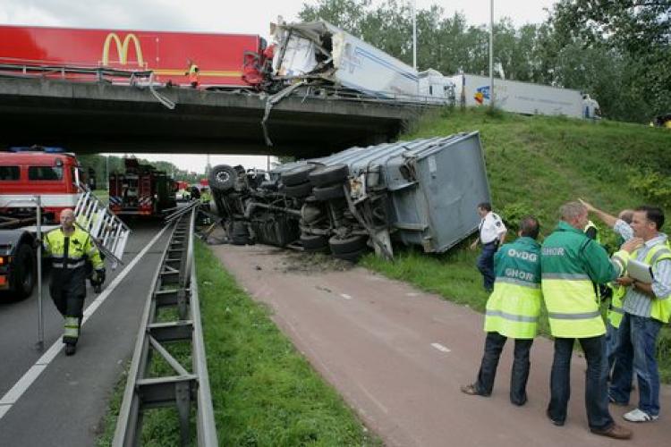 WOENSDAG - Bij een kettingbotsing op de snelweg A73 van Venlo naar Nijmegen is een vrachtwagen van een viaduct gestort. De vrachtwagen kwam terecht op een fietspad naast de doorgaande weg die onder de snelweg door loopt. De vrachtwagenchauffeur raakte bekneld en werd naar het ziekenhuis gebracht.