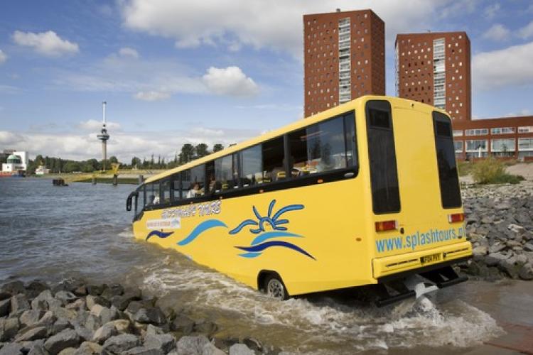 DONDERDAG - Een bijzondere attractie in Rotterdam. Met de amfibiebus van Splashtours kunnen tochten over de weg en door water worden gemaakt.