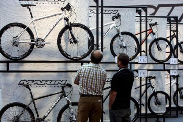 VRIJDAG - Bezoekers kijken op de internationale fietsbeurs Eurobike in het Duitse Friedrichshafen naar nieuwe modellen. De beurs trok dit jaar een recordaantal exposanten: 868 uit 37 landen.