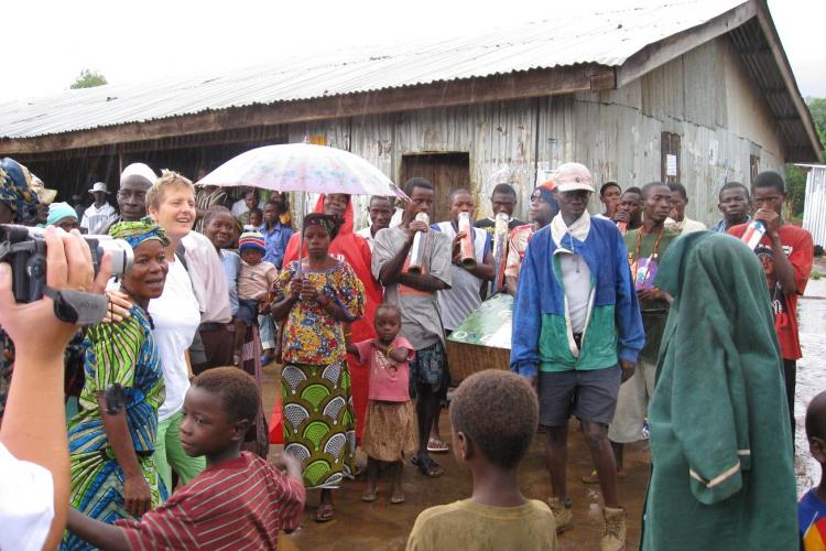 De overdracht van het gebouw aan de gemeenschap. Massaal worden de volksliederen gezongen. De kinderen zijn blij met de zonneklepjes van het Reformatorisch Dagblad.
