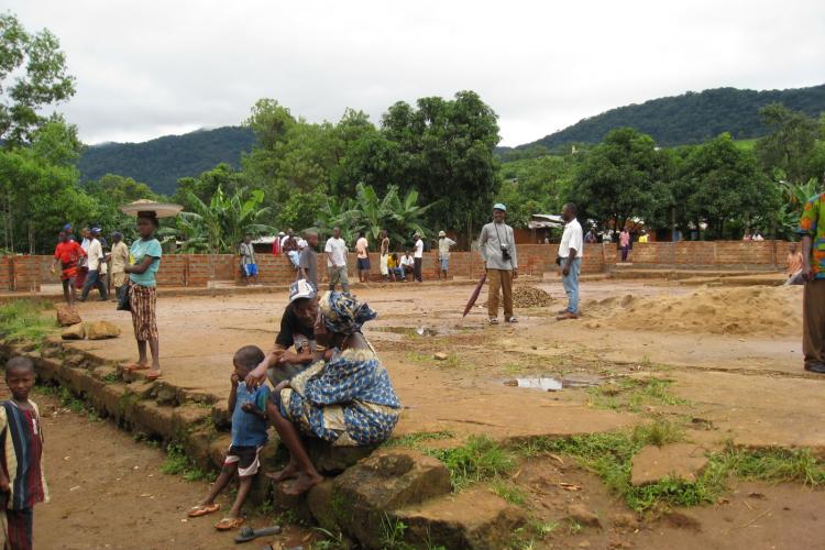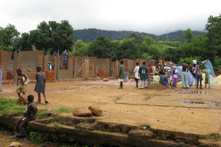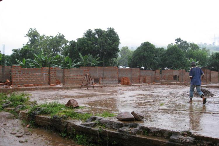 De eerste muren van de school zijn gebouwd. Jong en oud loopt over de bouwplaats. Barrevoets of op slippers. Arbo kennen ze hier niet.