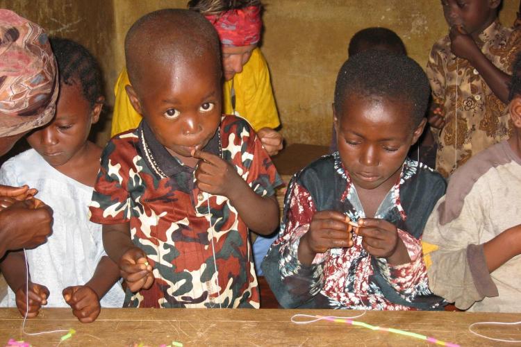 Kettingen maken, dat vinden de kinderen wel leuk. Na het zingen en bijbelverhaal mogen ze aan de slag. Heel wat kraaltjes verdwijnen in hun zakken. Het is een leuk gezicht om zelfs de leerkrachten een ketting te zien rijgen.