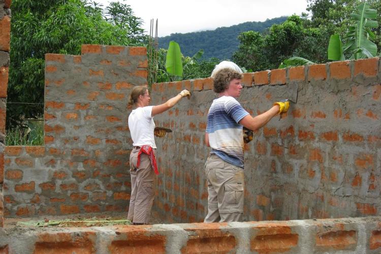 Na een ochtend metselen komt de regen opeens met bakken uit de lucht vallen. We moeten de bouw tijdelijk staken.