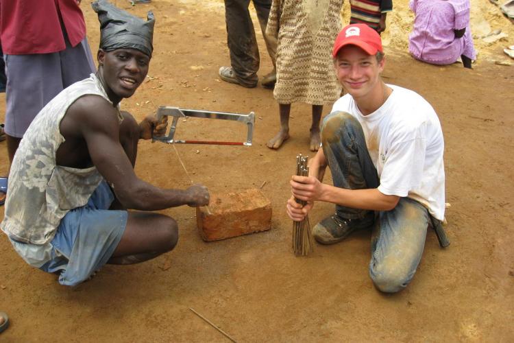 Betonijzer vlechten is een leuk werkje. Blank en zwart werken samen. Om je kroeskrulletjes te beschermen maak je gewoon een muts van vuilniszakken. Ibrahim (l.) liep altijd zingend over de bouwplaats.