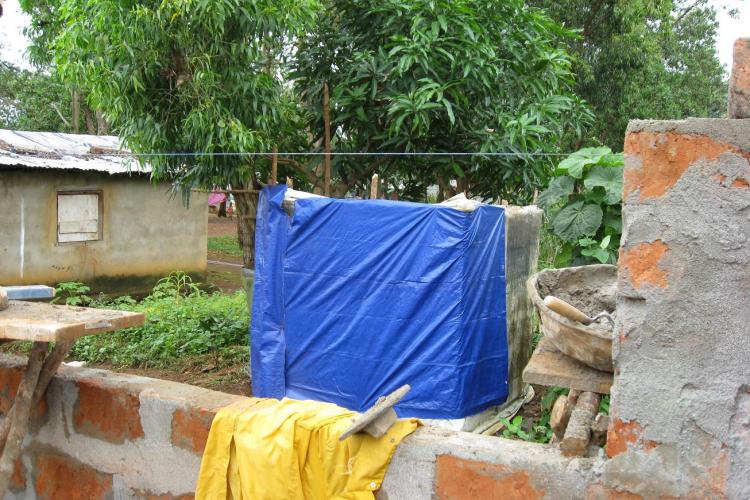Een toilet werd voor ons gemaakt. Vier stukken zeil en wat takken, een gat in de grond en een steen erboven op.