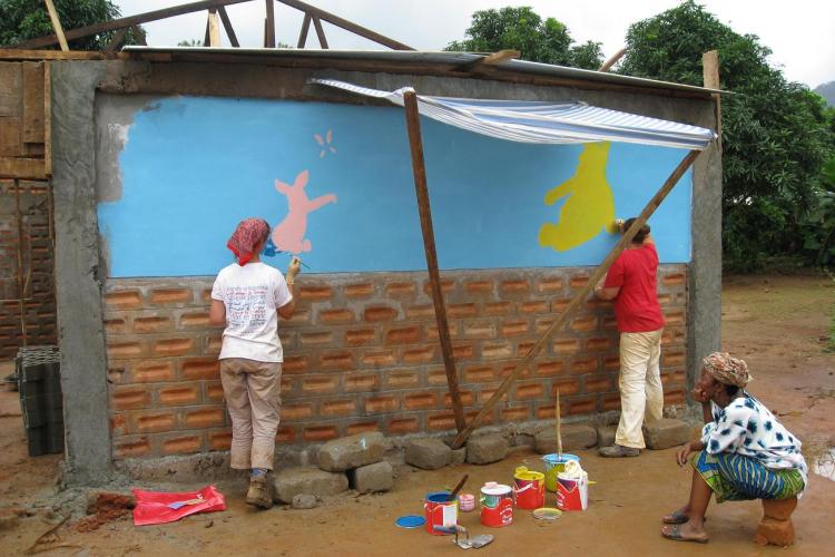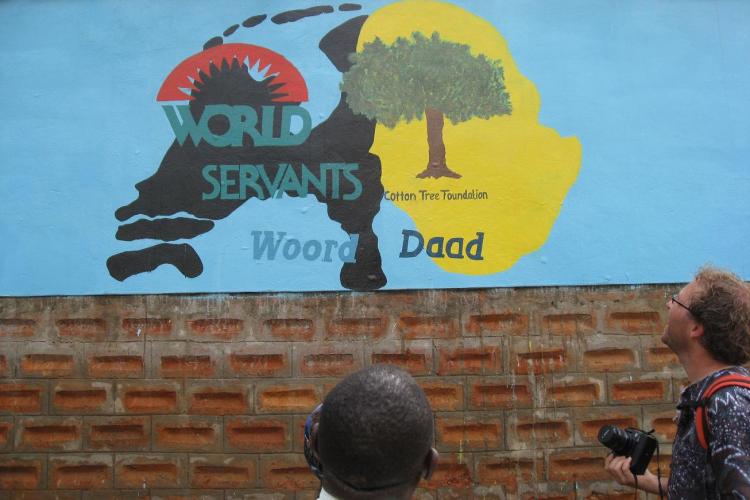 De muur is droog en de grondverf zit er op. We mogen nu zelf schilderingen aanbrengen. Vanwege de hevige regen die soms valt, maken we snel een afdakje.