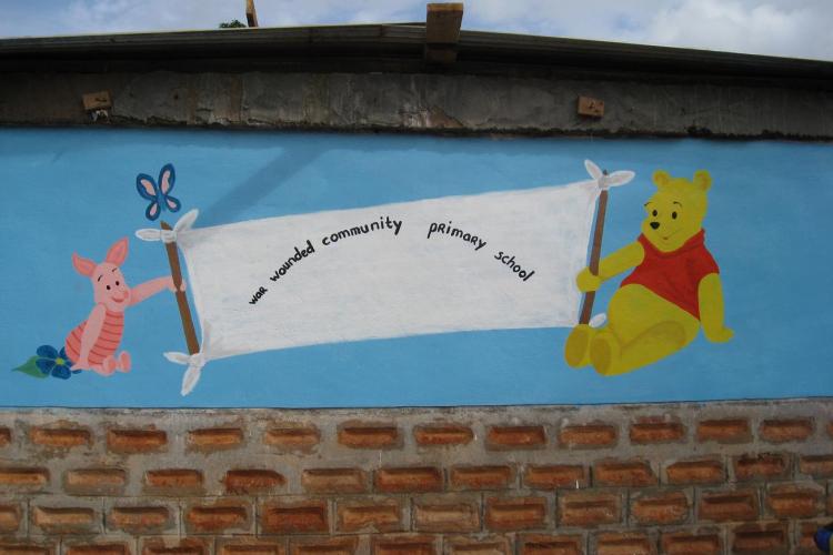 De schildering is af. Winnie de Poeh en Knorretje laten trots de naam van de school zien.