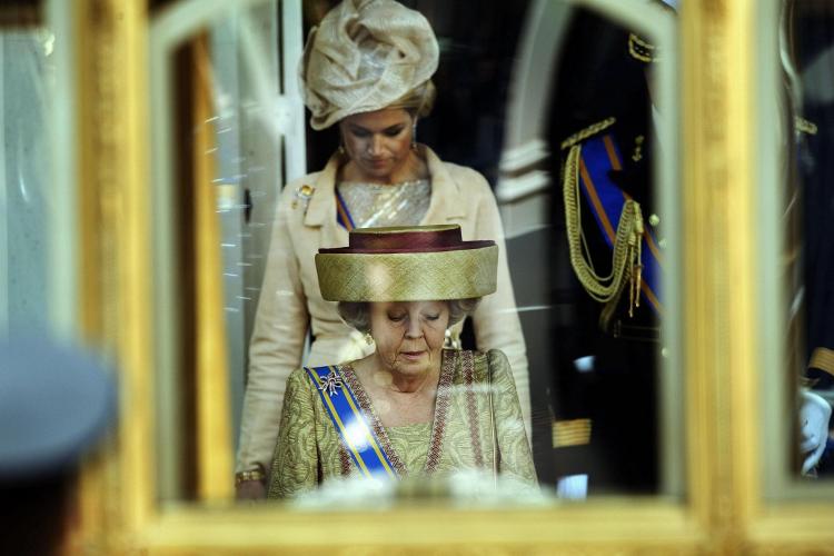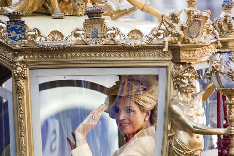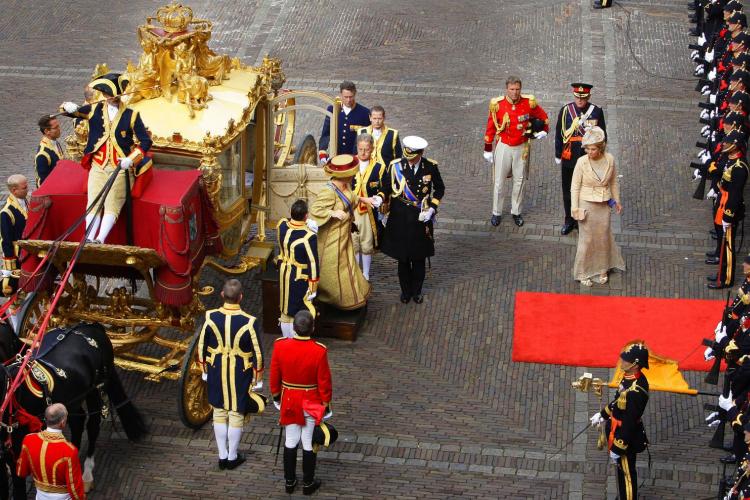 Prinses Máxima kijkt toe als koningin Beatrix uit de Gouden Koets stapt.