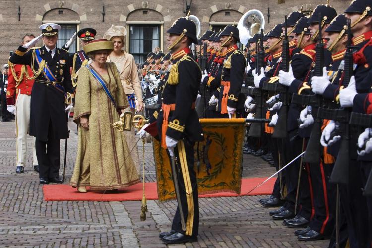 Koningin Beatrix, prinses Máxima en prins Willem-Alexander komen aan bij de Ridderzaal, waar de koningin de Troonrede voor zal lezen.