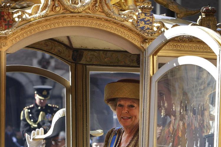 Koningin Beatrix en prinses Máxima stappen in de Gouden Koets.