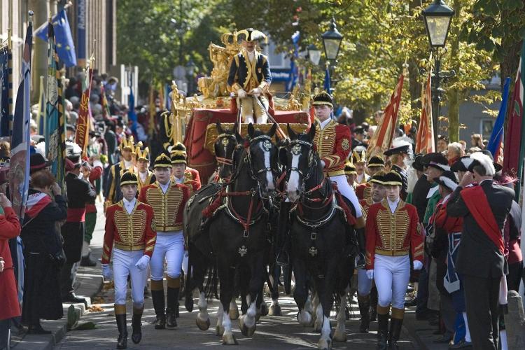 De Gouden Koets rijdt traditioneel van het paleis Noordeinde naar het Binnenhof.