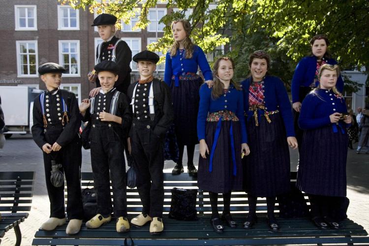 Jongens en meisjes in klederdracht wachten op de Gouden Koets.