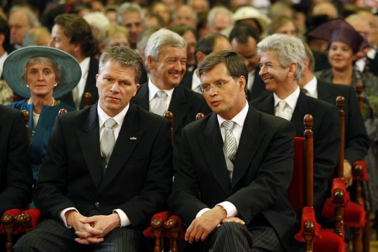 De leden van het kabinet, met op de eerste rij Minister Bos van Financiën (l.)en premier Balkenende, luisteren naar de Troonrede.