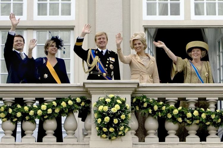 De balkonscene na afloop van de rijtoer. V.l.n.r. prins Constantijn, prinses Laurentien, prins Willem-Alexander, prinses Máxima en koningin Beatrix.