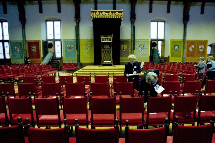 MAANDAG - In de Ridderzaal, waar koningin Beatrix dinsdag de troonrede voor zal lezen, worden briefjes met namen van de genodigden op stoelen gelegd. - Foto's RD, ANP, EPA