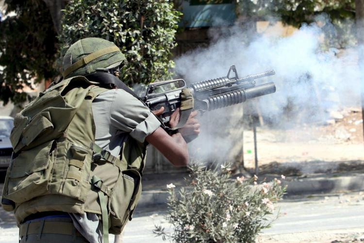 WOENSDAG - Een Israëlische militair schiet een traangasgranaat af op een Palestijnse menigte in het vluchtelingenkamp Al Ain. Bij de hevige vuurgevechten tussen het Israëlische leger en Palestijnse extremisten kwam zeker een Palestijn om het leven.