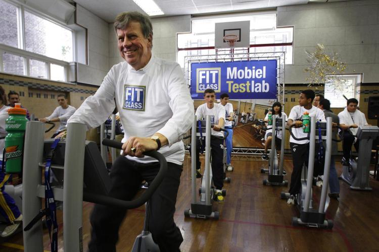 WOENSDAG - Burgemeester Opstelten van Rotterdam doet samen met een paar scholieren een conditietest. Hij geeft hiermee het startschot voor Fitclass binnen het onderwijs. Die campagne moet een oplossing bieden voor overgewicht onder jongeren.