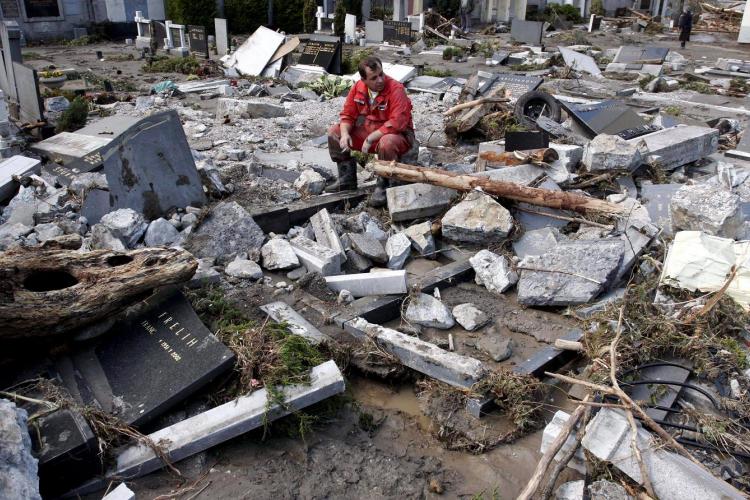 WOENSDAG – Een begraafplaats in Slovenië is verwoest door overstromingen. Grote delen van het Oost Europese land kampen met wateroverlast.