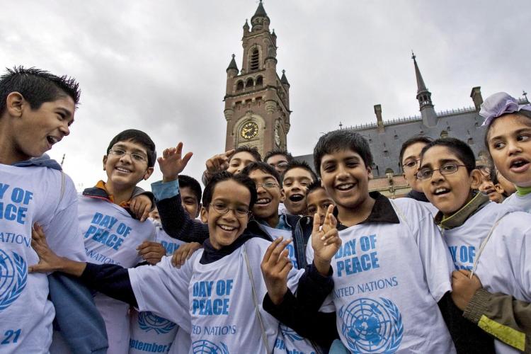 VRIJDAG – Burgemeester Deetman van Den Haag geeft het startschot voor de Internationale Dag van de Vrede. Ruim 1350 schoolkinderen laten op Het Plein witte ballonnen op. Alle kinderen waren gestoken in witte T shirts met de tekst ”Day of peace”.