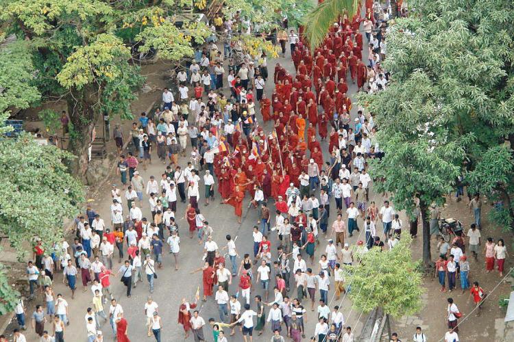 Monniken hebben veel aanzien. Toen ook de monniken gingen demonstreren durfde het regeringsleger eerst niet in te grijpen.