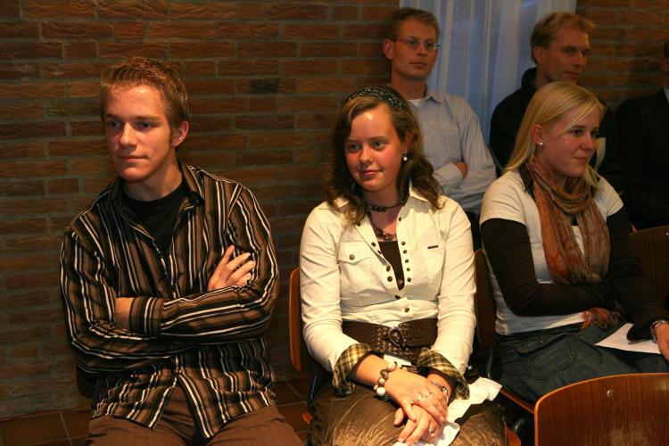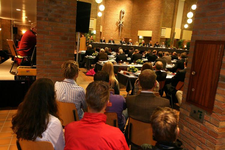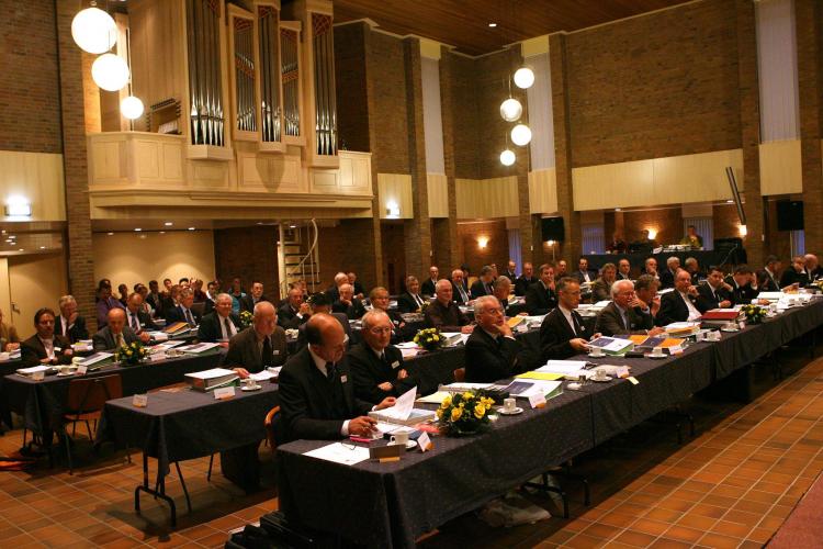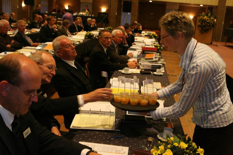 NUNSPEET – De leden van de generale synode van de Christelijke Gereformeerde Kerken (CGK) kregen dinsdagavond fruit geserveerd. Het was een gebaar van de jongerenorganisatie CGJO, waarmee ze de hoop op een vruchtbare bespreking over het jongerenwerk uitdrukten. Tijdens het agendapunt waren verschillende jongeren aanwezig. - Foto RD, Anton Dommerholt
