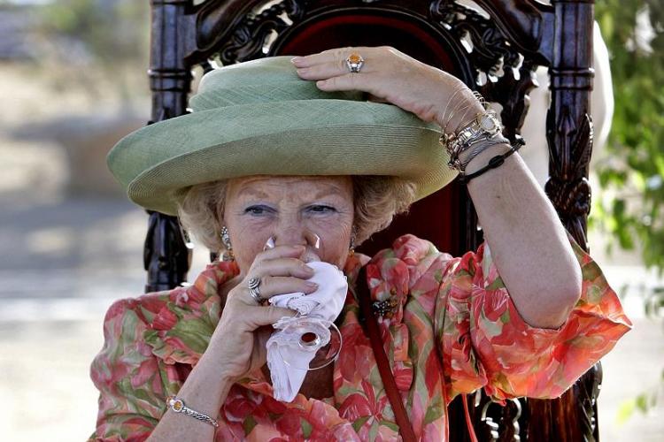 06-11-2006 - De wind op Aruba zorgt ervoor dat Koningin Beatrix tijdens haar bezoek aan de Nederlandse Antillen en Aruba haar hoedje af en toe moet vasthouden.